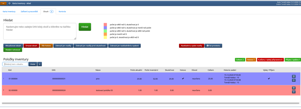 - pokud má položka zapsáno stejné množství jaké, je ve sloupci "počet inventární", je automaticky označena jako "Hotovo".