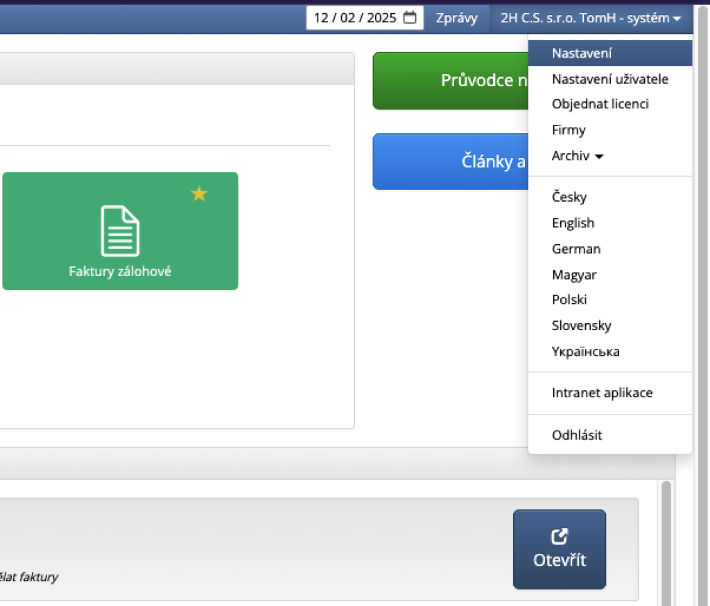 Po prvním spuštění aplikace je potřeba naskenovat ověřovací kód z Trynxu. Nejprve se tedy přihlašte do webové aplikace https://www.klienti.cz/application a jděte do nastavení: